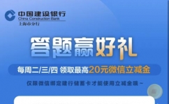 【活动内容】:参加中国建设银行上海市分行举办的答题领微信立减金活动,这个活动全国所有地区都可以参加,通过打开微信进去活动里,只要答对3道题就可以抽奖,可以抽到1-20元微信立减金,抽到立减金后用微信支付0.01元就可以领取,领到的立减金秒到账,可以在微信里支付的时候无门槛抵扣使用,也可以套X。