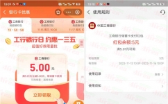参加工行举办的工行银行日约惠一三五活动,通过打开支付宝APP进去活动里,绑定了工商银行卡的,可以直接领取到5元支付宝红包,有的号领到的是满5.01元用,有的号领的满500元用,可以在支付宝APP付款的时候选择工商银行卡支付就可以抵扣,每天限量,如果当天领完了就下一个活动日再去,每周一、周三、周五上午10点开始。