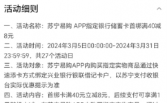 首绑卡满40元立减8元,后续支付可享满1元随机立减,在苏宁易购APP内购买指定实物商品,通过快速添卡方式绑定兴业银行银联借记卡,可享首绑卡满40元立减8元,后续支付可享满1元随机立减。其中首绑卡满减每日名额4500个,随机立减每日名额约2963个。名额有限,先到先得。苏宁易购APP指定银行储蓄卡首绑签约支付满40减8元和苏宁易购APP指定银行储蓄卡签约支付满1元随机立减活动,两档活动共享优惠次数,单用户每个活动日可享1次优惠,整个活动期间累计可享4次优惠,其中首绑签约支付满40减8元活动,单用户活动期间限享1次优惠。苏宁拼购、苏宁国际及虚拟类等商品不参加活动。目前仅兴业借记卡可享,后续如有调整,以苏宁支付收银台实际优惠提示为准。