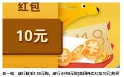 【活动内容】:建行7.99元购买20元美团外卖红包,建行数字人民币+建行储蓄卡+建行信用卡都可以参与,数字人民币享受8.01-8元,储蓄卡和信用卡享受10-5元。 关注【趣订生活】微信点菜单栏【文旅生活】进入顶部搜索【美团】--选择【热销商品】可以看到【建行数币2.99元购,美团外卖红包10元】进入购买输入要充值的手机号,付款时选择 建行数字人民币 和 微信支付(建行储蓄卡/信用卡)各参与1次,相当于数币2.99元买1次10元,储蓄卡或信用卡5元买1次10元。一共7.99元2张10元。