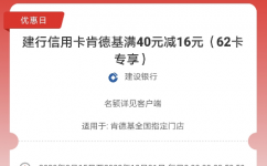 【活动内容】: 活动期间每天上午8:00:00起,用户通过肯德基APP手机自助订餐(限外送到家、到店自取、点K咖啡),在支付页面点击银联支付后,使用云闪付支付(选择已绑定的建设银行发行的62开头龙卡信用卡银联单标卡);或在肯德基门店线下点餐,使用云闪付APP付款码被扫支付(选择已绑定的建设银行发行的62开头龙卡信用卡银联单标卡),享单笔订单实付金额满40元立减16元优惠。单用户单日限享受1次优惠,单月限享受4次优惠。每自然月优惠限量68000份,名额用完当月活动即结束;肯德基店内支付和APP线上支付优惠名额共享。