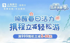 【活动内容】: 活动期间每天8点起,上海银行信用卡用户登录携程旅行App使用“程支付”绑定上海银行信用卡下单酒店、机票、火车票、门票、旅游商品(部分特殊商品除外),即可享单笔订单实付金额满999元随机立减5-99元优惠。 同一用户活动期间限享2次优惠。名额有限,抢完为止。部分特殊商品指:途家民宿;酒店到店付房型或担保房型;火车票官网免费直购(12306订购);火车票抢票订单保险产品;风控类产品等,具体以携程收银台是否显示立减优惠为准。