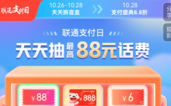 【活动内容】: 1、【天天拆盲盒】每天可参与一次拆盲盒,奖品包括:888元京东E卡、满100减88元话费券、满10减6元话费券、满5减2元银联消费券等; 2、【支付盛典8.8折】10月28日上午10:00放送8.8折优惠,最高减8元,其中信用卡还款2000份;通信交费8000份,限为联通号码充值且被充值号码与登录号码一致:精选场景1000份,包括:沃百富商城/网易严选/天猫优选/美团外卖/泡泡兑换商城;同一手机号、同一身份证号、同一沃支付账户在上述各类支付场景限享优惠一次; 3、【权益福利大放送】免费领28元无门槛生活+福利券,可用于购买权益包生活+。