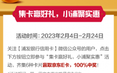 【活动内容】: 1、集卡赢好礼,小浦聚实惠 截止至2023年2月24日,关注【浦发银行信用卡】微信公众号的用户,点击下方按钮立即参与“集卡赢好礼,小浦聚实惠”活动,齐集6种卡片赢取京东E卡,100%中奖。活动期间,同一用户中奖次数最多为2次。 2、“浦降洪福”接者有份 截止至2023年2月24日每周五全天,关注【浦发银行信用卡】微信公众号的用户,点击下方按钮或通过【集卡赢好礼,小浦聚实惠】活动底部活动位,即可参与“浦降洪福,接者有份”抽奖活动,玩游戏即有机会赢取5元京东E卡、10元京东E卡、20元京东E卡。活动期间,奖品有限,同一用户中奖次数最多为1次。