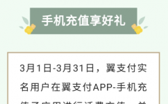 【活动内容】: 1、手机充值享好礼 3月1日-3月31日,翼支付实名用户在翼支付APP-手机充值子应用进行话费充值,单笔订单满10元可享受不限次数的笔笔立减(上限10元)及最高1次免单(免单金额上限200元)。 3月每周五10:00:00-23:59:59,用户在翼支付APP充值话费,使用邮储银行借记卡消费时享受单笔满80立减10元优惠,每周五限额前2170名用户参与,名额有限,用完即止。 2、生活缴费有优惠 3月1日-3月31日,翼支付实名用户在翼支付APP-生活缴费子应用进行生活缴费,单笔订单满10元可享受0.01-2元的随机立减。(单用户每月最高优惠2元)