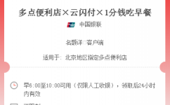 【活动内容】: 使用云闪付乘车码刷码乘坐地铁,可在“进出站页”中领取1分钱多点早餐券。用户使用云闪付APP银联二维码在每日上午6:00-10:00在多点便利店消费时可享受优惠(当支付金额小于10元时,需支付1分钱;当支付金额大于10元时,则立减10元); 领取次数:单用户当日多点早餐券限领取1张,每周限领取2张,活动期间限制领取6张。数量有限,先到先得; 优惠券有效期:用户获券后24小时内有效; 优惠券查看:用户可在“云闪付—我的—奖励—我的票券”中查看已领优惠券; 特别提示:优惠券仅限在多点便利店人工收银台核销使用,不可使用自助收银机。具体多点门店地址可在适用门店中查询。
