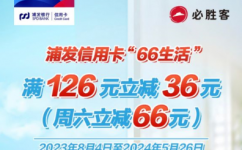 活动期间,每周六持卡人在必胜客指定活动门店出示“浦大喜奔”APP银联付款码支付,或在必胜客指定消费场景(“必胜客”APP/“必胜客”微信小程序选择扫码点餐、到店自取、外送点餐下单通过银联云闪付)绑定浦发银行信用卡支付,单笔订单消费成功支付满126元,即可享受66元优惠立减。活动期间,每位持卡人每季度限享受1次立减优惠,每个活动日不少于1500个优惠名额(当日未使用完的名额流转至下周六使用),先到先得。
