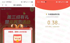 大成基金的活动又来了,建议老用户参加,大成基金经常会有类似的活动,虽然并非必中,但是概率还是可以的,通过下载打开大成基金APP,登录后点击弹窗进去活动里可以直接抽奖1次,有机会抽到一个0.38-188元随机不等的红包,抽到红包之后再去微信公众号领取就会推送。