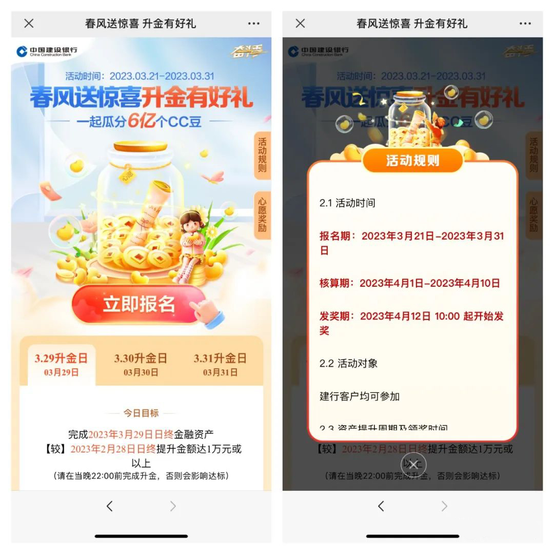 建行的一个活动,可以参与任务领取建行的cc豆,再去用豆子兑换猫超卡、京东E卡、加油卡、肯德基麦当劳余额等,有时候还能补库存兑换微信立减金,不定期建行会补货商品的,参加中国建设银行心愿储蓄开年有礼活动,通过打开微信进去活动里报名参加,然后在2月6日22点前给建行卡转入1万元进去(在2月9日后可以转出来),然后就可以获得瓜分6亿个CC豆资格,上一期瓜分了2900多个CC豆(价值29元),每1000个CC豆=10元,可以直接兑换成多张10元京东卡、10元天猫超市卡等等。 结束时间:3月31日结束 1、微信扫描下面二维码进去活动里报名参加,然后在3月29日22点前给自己的建行卡转入1万元进去(转入存kuan也算的,在4月1日之后再转出来就行),然后就可以获得瓜分6亿个CC豆资格。