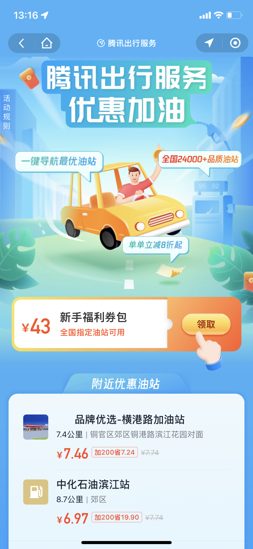 除此之外它还联合【加油站优惠券】推出了多项优惠活动,大家如果近期有加油这方面的需求的话,通过微信关注公众号【加油站优惠券】获得相应的优惠券或者加油卡,从而实现更加实惠的油品购买。关注该平台即可免费获得腾讯加油优惠券!加油站优惠券会为每位用户推出元的腾讯加油福利券包,里面含3张加油券。其中15元券*1张、14元券*1张和9元券*1张,都是满200可用,附近线下加油站均可使用,单单加油八折起。另外,公众号【加油站优惠券】还为大家准备了价值43元的新手福利券包,领取后30天内均可使用。 在出发前,大家可以在优惠加油页面查看并选择油站,一键导航前往。到了加油站后,告知加油员使用腾讯出行加油服务,并询问油枪号及金额,最后确认油站、油枪号及金额,点击支付就能享受立减优惠了。 |