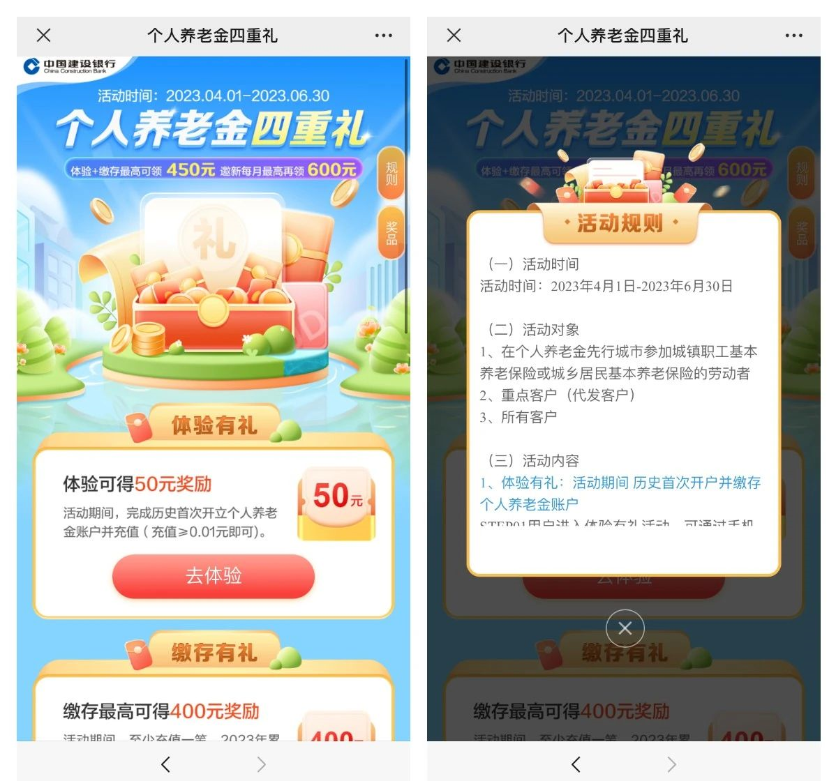 活动一:建行开个人养老领50元微信立减金