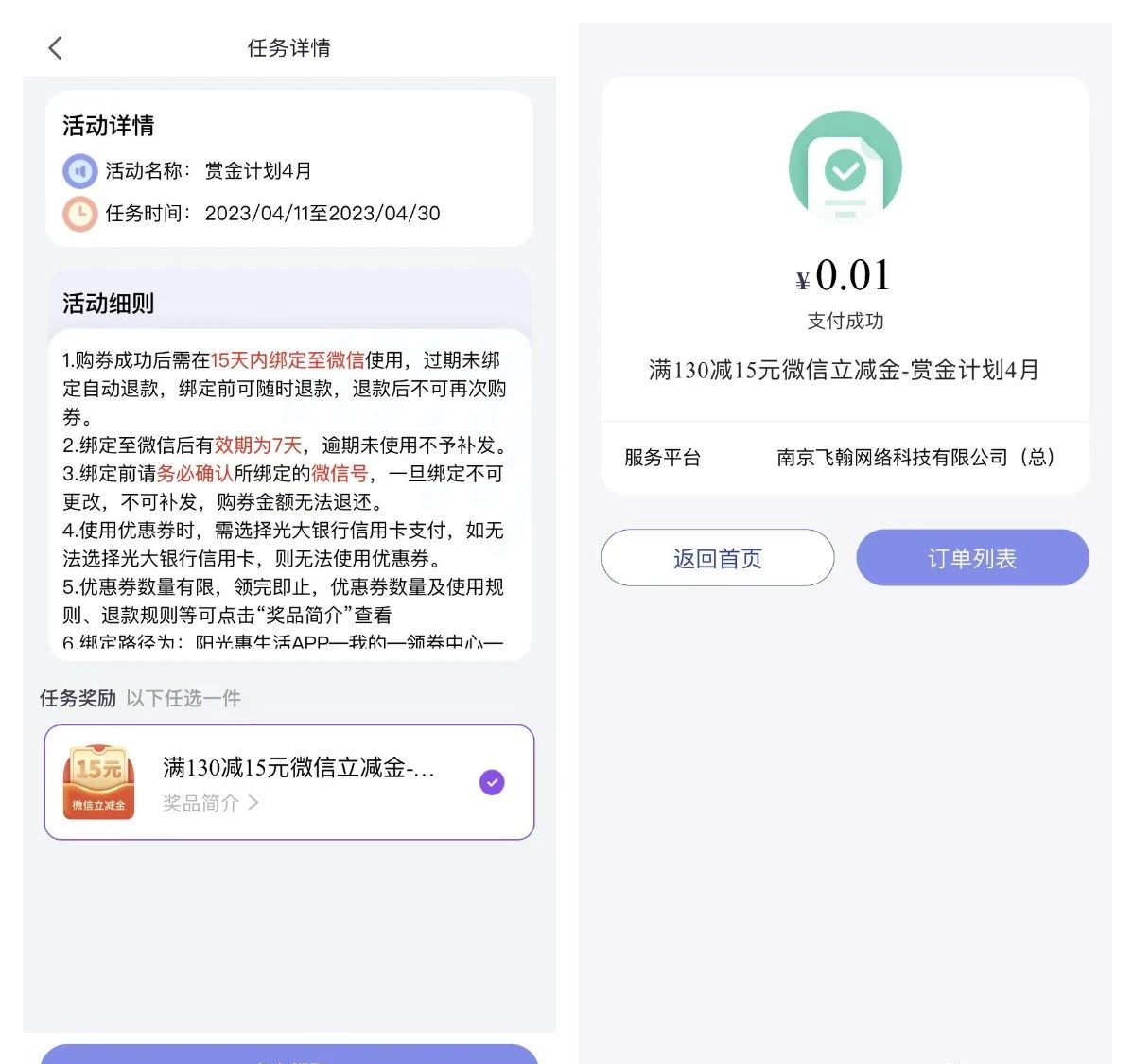 2、根据提示点“订单列表”可以添加到微信卡券包满130元立减15元。 活动二:光大储蓄卡完成任务领20元微信立减金