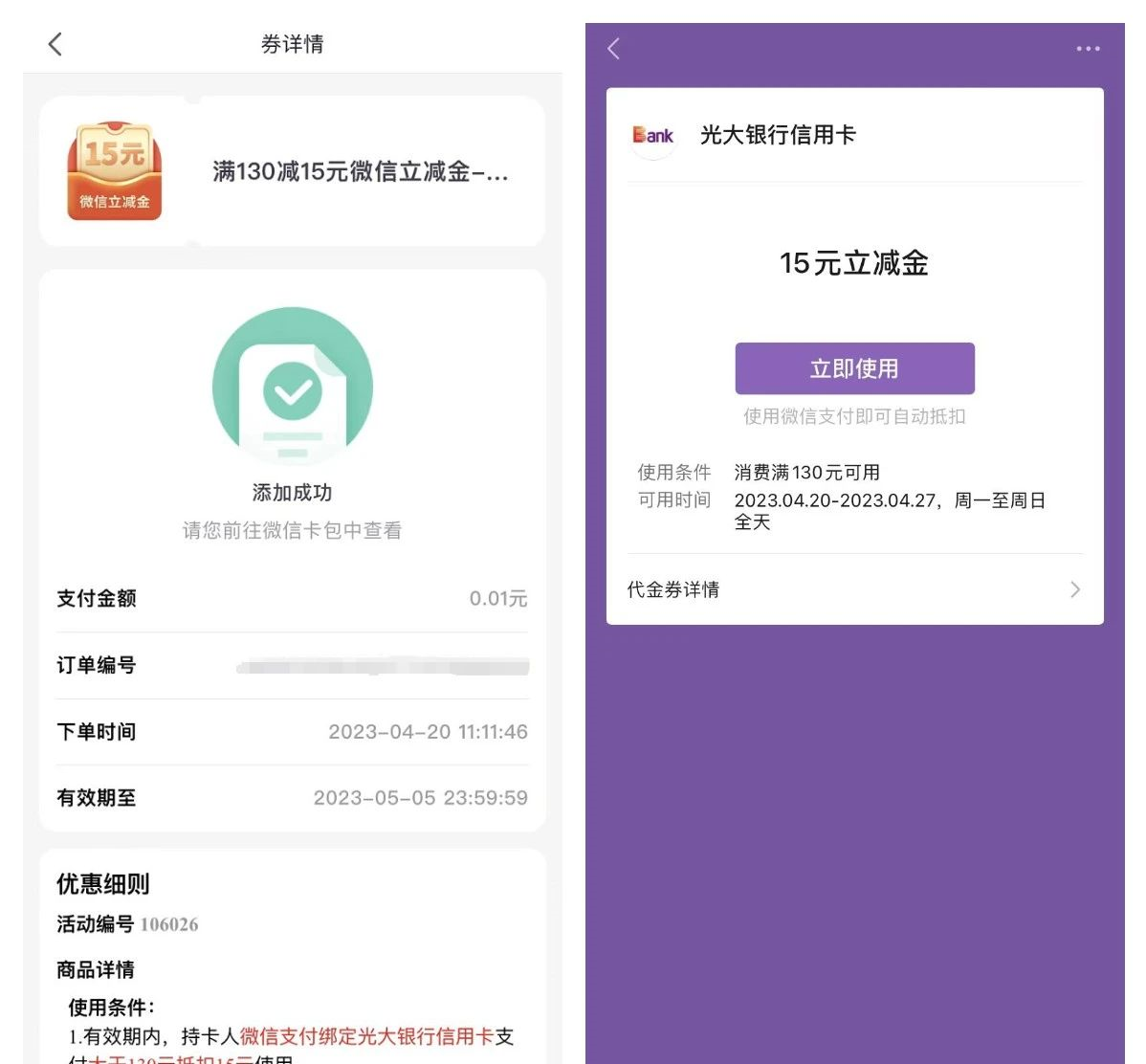 两个微信立减金的活动,一个是光大储蓄卡一个是光大信用卡的活动,两个活动都很简单。光大信用卡:大部分人直接到光大旗下的阳光惠生活直接领取15元微信立减金(满130元立减的,需付1分钱后领取)秒到账;光大储蓄卡:完成周周存或者季季存签约的领取20元微信立减金,需要7月份才能到账。 结束时间:本期4月30日结束