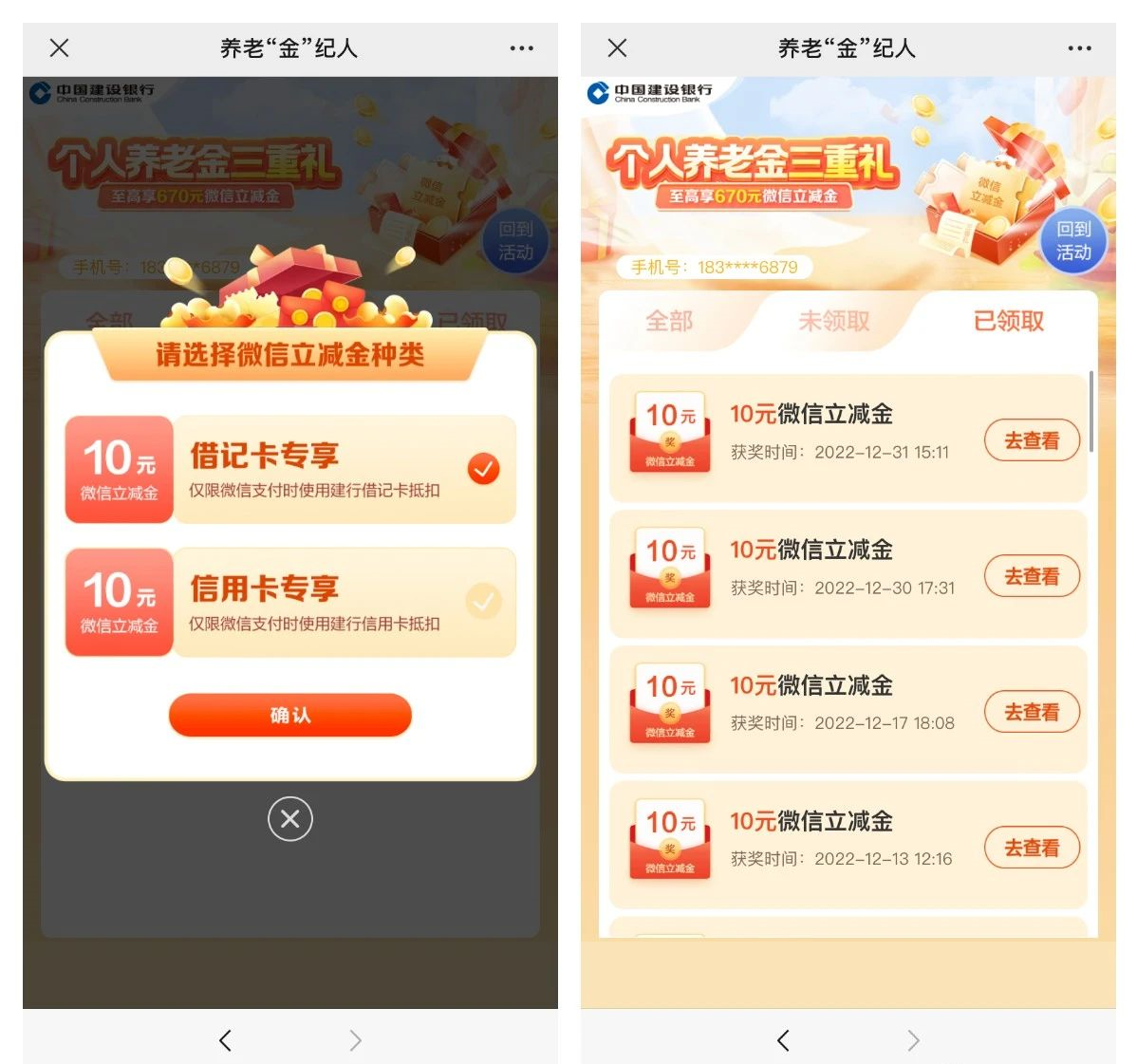 扫码参与活动,开通建行的个人养老(一类二类卡都能参与活动),转入0.01元体验就能领取50元的微信立减金了,3天之后才会有达标显示的; 最终3天之后可以领取50元的微信立减金,可以选择建行储蓄卡或者信用卡添加到卡券包,支付的时候就能抵扣立减了。 更多银行优惠资讯活动欢迎微信关注公众号【权益会员超市】,该平台是一家专注薅羊毛活动,优惠省钱线报资讯分享平台。可以为广大用户提供一个专业羊毛客线报优惠交流平台,里面不仅有银行优惠活动,还有各种餐饮美食优惠券、外卖优惠券、打车优惠券、加油优惠券、快递优惠券、酒店优惠券、电影特价票等等,喜欢薅羊毛的小伙伴们一定不能错过这个平台! |