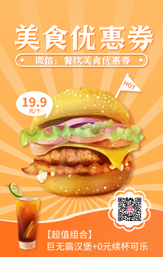 大家只需微信关注公众号【餐饮美食优惠券】平台就可以免费领取到汉堡王优惠券。其中的优惠券包括狠霸王鸡堡单人餐,双堡餐!