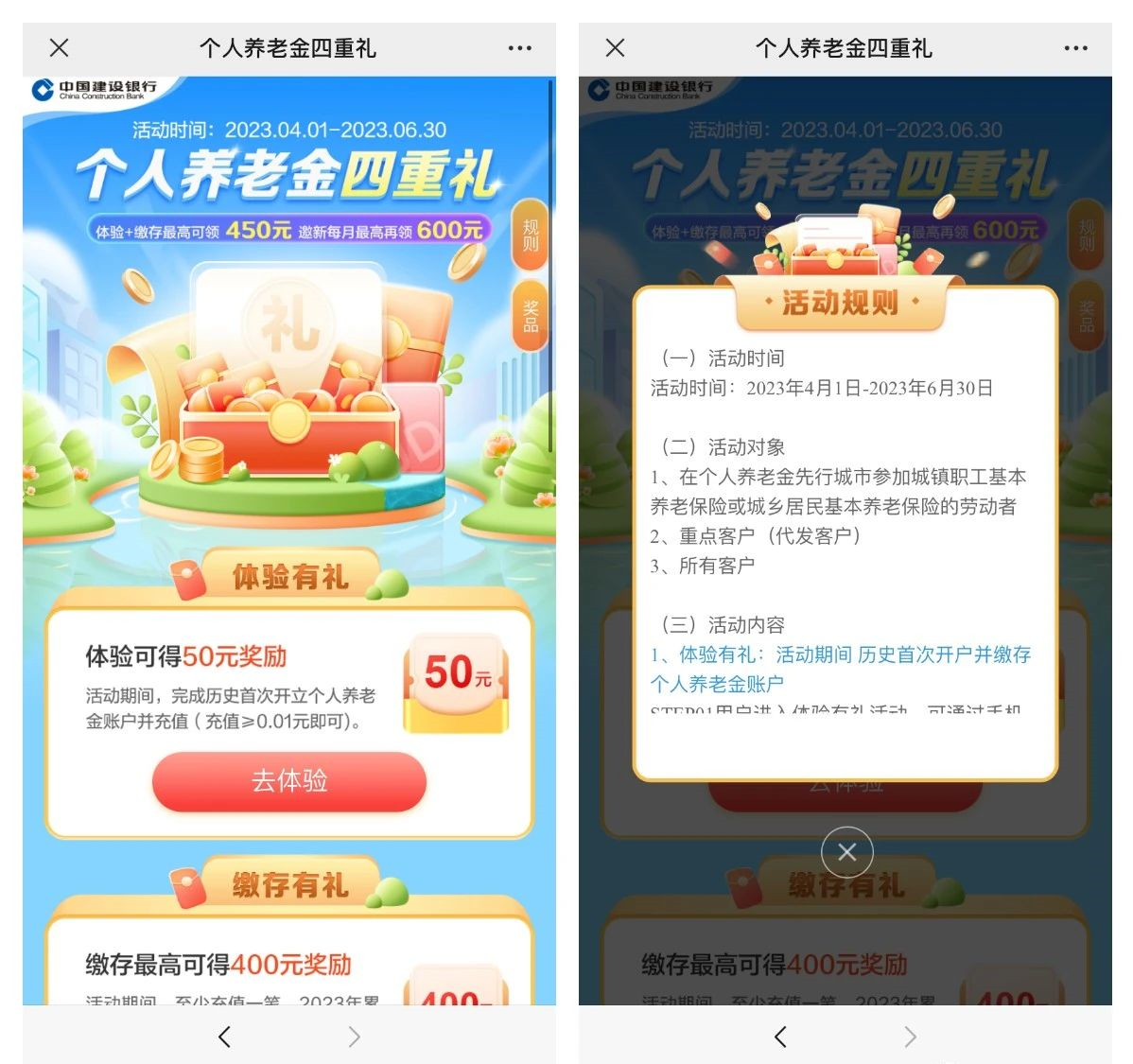 扫码参与活动,开通建行的个人养老(一类二类卡都能参与活动),转入0.01元体验就能领取50元的微信立减金了,3天之后才会有达标显示的; 最终3天之后可以领取50元的微信立减金,可以选择建行储蓄卡或者信用卡添加到卡券包,支付的时候就能抵扣立减了。