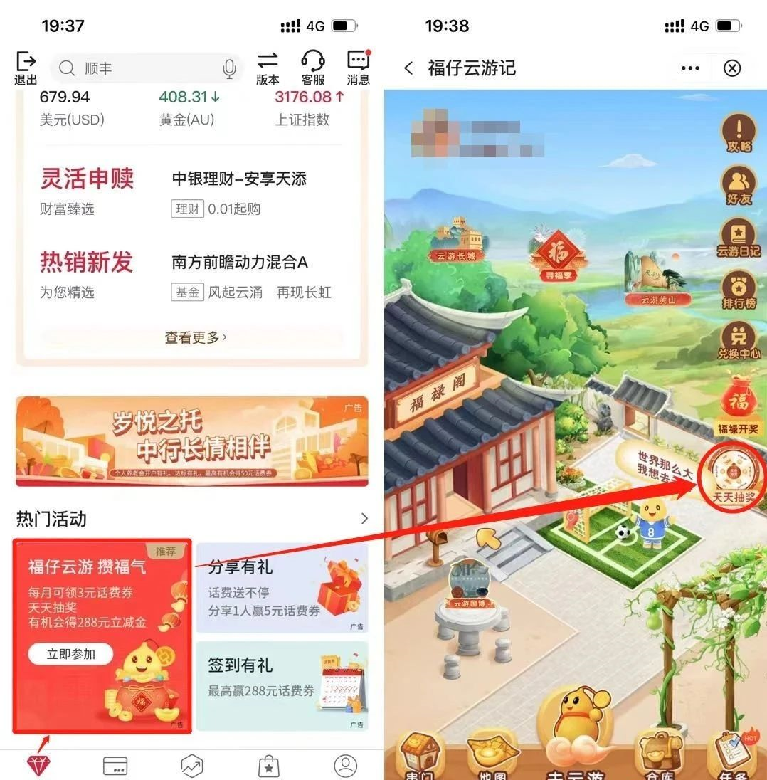 10、中行APP搜索“BOBO鱼塘”进入活动入口,每月15号以后可以用BoBo币兑换微信立减金,BoBo币的获取方式很简单完成基础的任务就行了,5元微信立减金(2000币+1元),10元立减金(5000币),50元立减金(25000币)。 11、中行APP首页热门活动“福仔云游 攒福气”或首页搜索“福仔云游记”进去活动入口,限制V3以上的会员可以15点以后抽微信立减金,每月基本可以中一次。