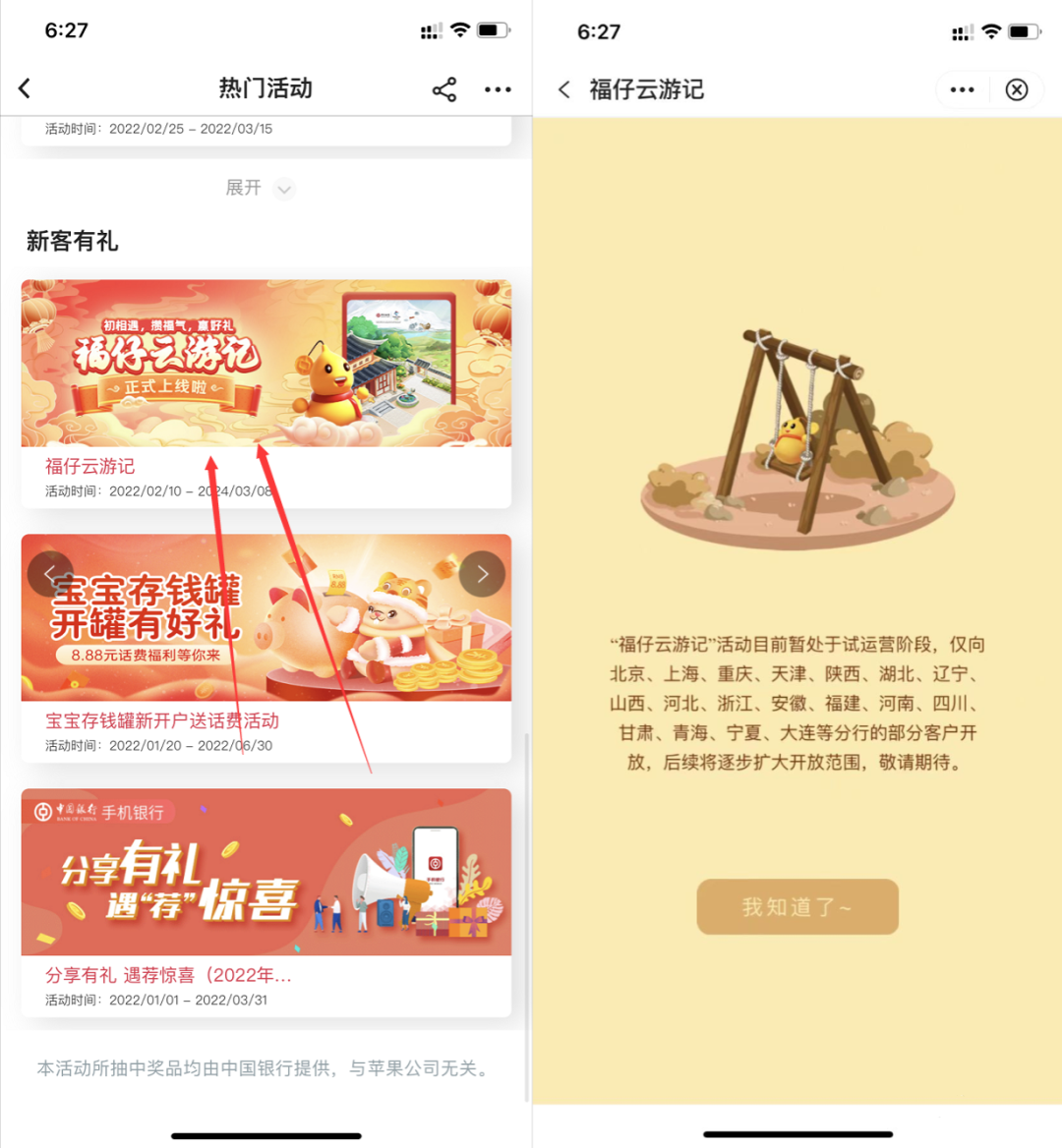 2、中行app首页下拉热门活动,点进去下拉福仔云游记,右侧点福禄开奖,进去领5元话费券;如果不在这个活动地区的可以去领签到的话费券2元。