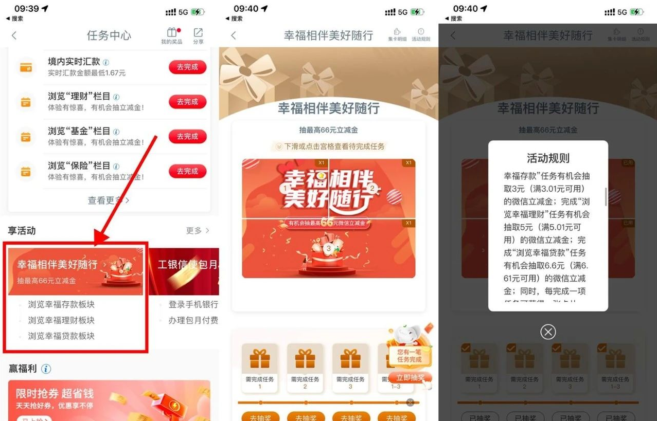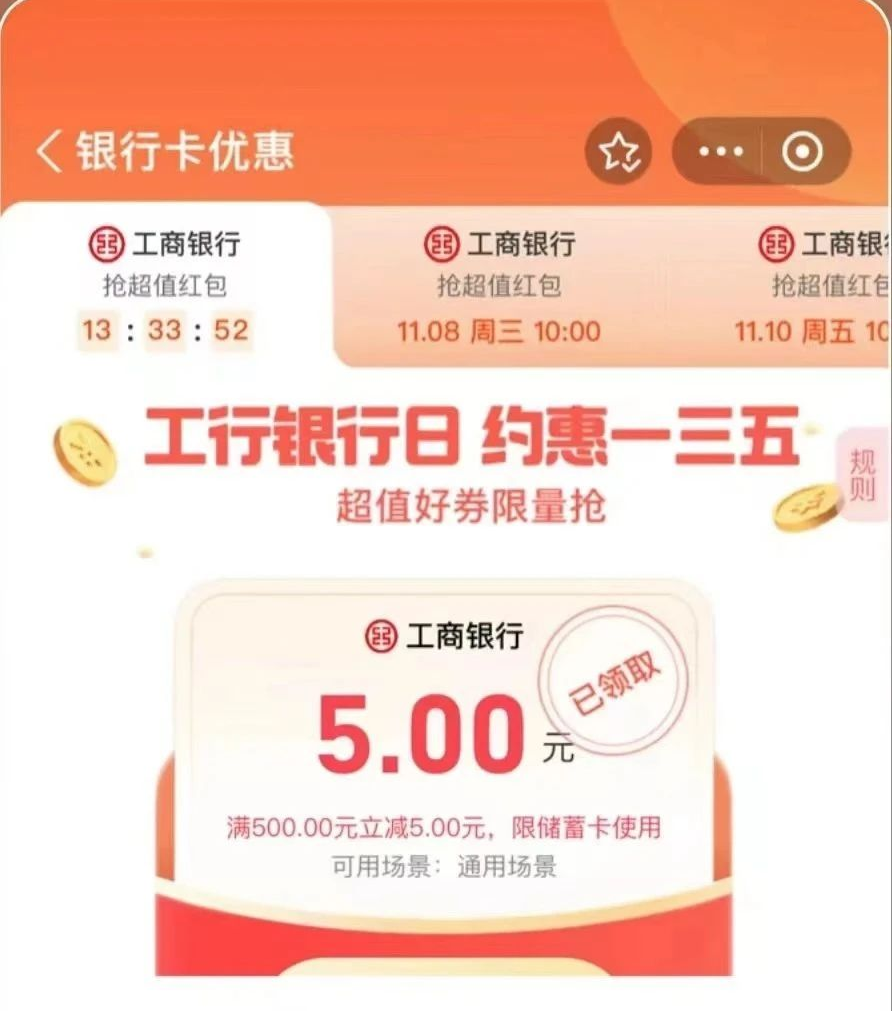 1、工行信用卡(20元) e生活plus首页“爱购消费券”图标或轮播图入口进入,工行信用卡消费5元/笔,2笔可领5元微信立减金或支付宝红包,5笔可领20-5饿了么支付券等,8笔可领30-10天猫超市支付券等,注意系统判定达标需3~7天! 2、工行储蓄卡(1.88~66元) 中国工商银行APP“任务中心”每周四有各种浏览任务,可中1.88~66元储蓄卡立减金,其中微信任务中奖概率最高。 另外平常还有一些偶发性的活动也是简单的浏览就能抽取的。比如:幸福相伴 美好随行->简单浏览得4次机会抽3~66元微信立减金。 3、工行储蓄卡(2~5元) 工银兴农通APP-我的-任务中心,每个节气当天9点后都有节气有礼,必得2~5元微信立减金,下一个节气是立冬(11.8)。 4、工行信用卡(3元) e生活plus首页轮播图“e起乐合合”,每天1次但可以做任务赢次数,把一样的东西放一起合成得分,分数达到200分就可以抽奖,概率中3元微信立减金,没中的多玩几次,活动期间应该每人都能中一次立减金。 5、工行信用卡(11.11元) 中国工商银行APP-我的-左上角切换北京-回首页搜索“消费季”每周四领信用卡200-11.11京东支付券,需要持有北京分行卡,或者北京工行的二类卡用户。 6、工行信用卡(5~3888元) e生活plus首页轮播图“爱购消费券达标领最高3888元微信立减金”进入,工行信用卡当月消费满1千/2千/4千/6千/1万/2万/3万可分别获得对应档位的领取次数,每次可领取5~3888元微信立减金,注意系统判定达标需3~7天!