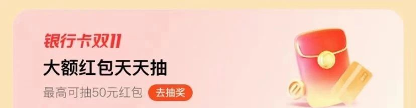 四、工行卡5元支付红包、双11支付立减 每周一、三、五上午10点起,支付宝APP-搜"支付宝银行卡优惠"-下拉"工行银行日",领500-5元,可以直接信用卡还款用。支付宝APP扫码打开。另外上午实测实名小号,还能再领! 支付宝APP-搜索“银行卡双11”进入活动页面往下翻有个“大额红包天天抽”每天可抽3次,可中500-20,1000-50,2000-60等支付红包,其中储蓄卡的红包可以直接还信用卡用!每天0点放水,准点抽中大包概率大。