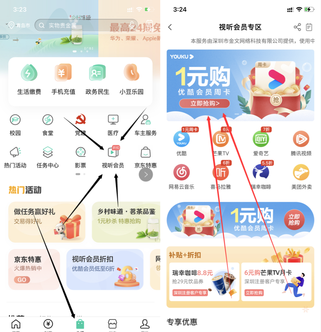 1、打开农行APP—生活—视听会员,找到1元开通7天优酷会员的活动;