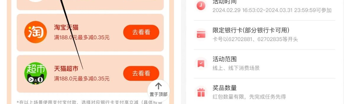 3月份的工行的两组支付红包活动,其中工行是储蓄卡和信用卡都能领的,有的地区的信用卡看不见报名的地方可以搜索一下银行卡优惠!