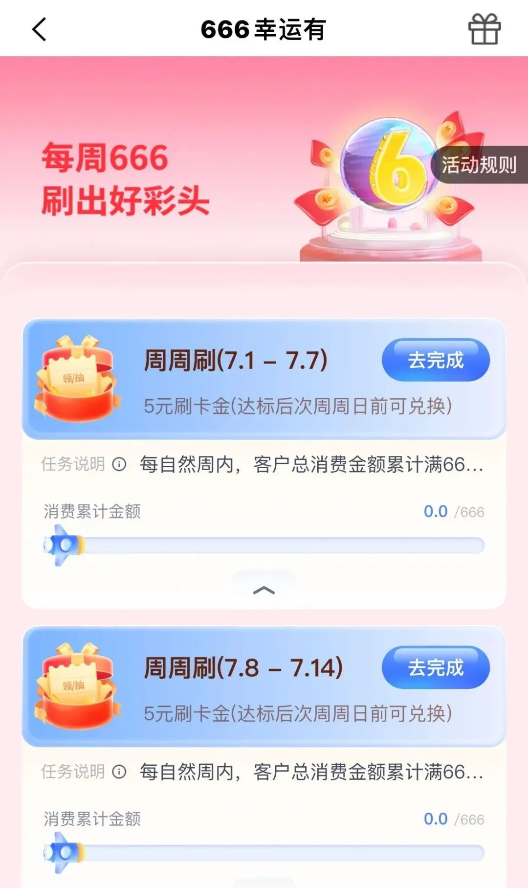 每自然周内,客户总消费金额累计满666,可6积分兑换5元刷卡金【T+3工作日可兑换】2024年6月24日起至2024年7月28日,共计5周;还可以玩3周,能拿15元刷卡金! 两个活动路径:兴业生活APP - 首页 - 周周刷和6积分兑刷卡金