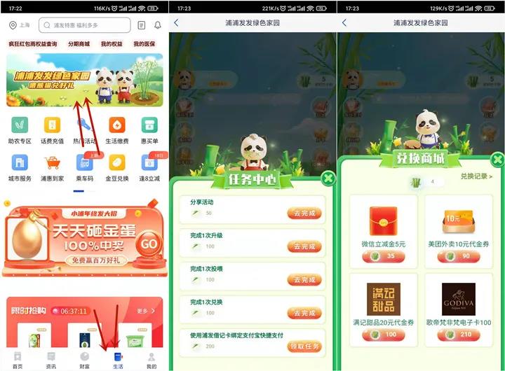打开浦发银行APP 点击生活 再点顶部轮番图【浦浦发发绿色家园 喂熊猫兑好礼】进入活动
