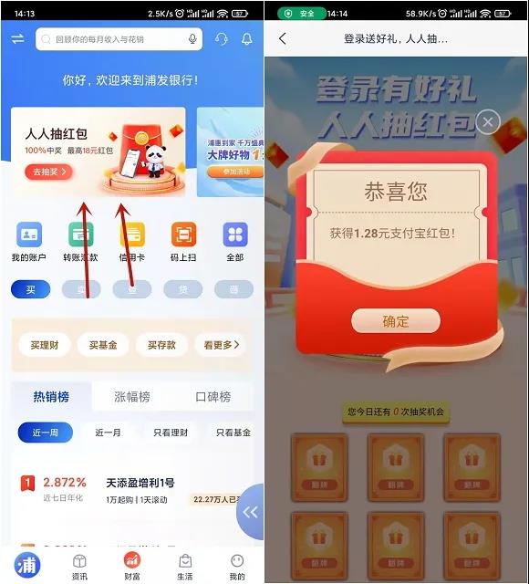 各大应用商店搜索下载【浦发银行】APP 登录后点击首页的【人人抽红包】进入活动