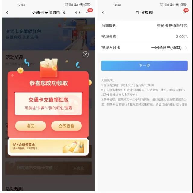 活动二 招商银行0撸3元现金红包 手机打开链接跳转至招商银行APP参与活动 完成交通卡充值即可领取3元现金红包! 跟着步骤走即可!一分钟即可完成!退款如果没秒退到银行卡,肯定是会退款到账的,放心! 新一期_招商银行0撸3元现金红包 招商银行APP首页搜索【武汉通】点进去后点左边的【立即充值】 然后点充值进去 充值30元后,点充值订单进去,申请退款,退款秒到账!然后我们再打开活动地址进入活动页面领取3元现金红包! |