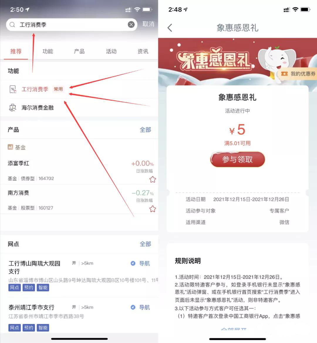 1、工商银行APP搜索【工行消费季】点功能进去后直接领取,有的用户直接打开工行APP也能直接跳转出来,如果没有领到的话可以等下周再去领。