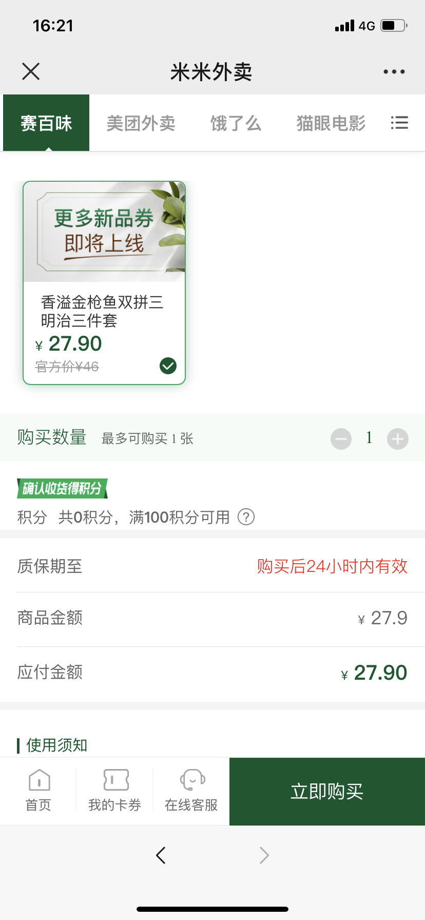 如果大家吃饭时选择赛百味这家店的话,小编建议大家可以提前关注微信【餐饮美食优惠券】,关注成功后,在菜单栏中就会看到赛百味优惠券了。据悉,在该平台原价46元的香溢金枪鱼双拼三明治三件套只需27.9元就能到手,是的你没听错只要27.9,是不是非常划算?其套餐内容:6英寸香溢金枪鱼双拼三明治(一勺金枪鱼+一勺蛋料)*1+任意风味曲奇*1+机打饮料(冷杯)*1。 |