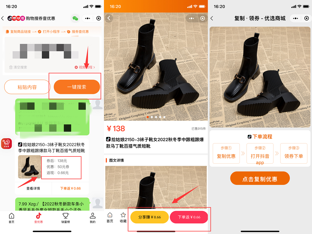 因为抖音是内容平台,用户更愿意在上面浏览内容,抖音电商前两年叫兴趣电商,主要帮用户发现、激发,然后产生一些购买行为,据此,前两年聚焦在用户决策的前半链路。加上这两年进场商家增多,让商品供给丰富度提高,用户发现抖音电商能够买到更多好东西,从而强化主动搜、主动来购的动作,以致于用户购买行为从前半链路,往后半链路延伸和强化。 那么如何在抖音商城购物才能便宜呢?这不,据最新消息,抖音经常会在微信【线报惠优惠券】发放大量购物优惠券~在该平台不仅购买自己心仪的商品能得到优惠,把商品推荐给好友你还能得到返利佣金。大家关注成功后点击下方菜单栏“抖音惠购”即可打开线报惠首页,这时大家就可以在首页中看到抖音购物优惠券的领取入口。 接着大家点击抖音优惠即可,将所要购买的商品链接复制在搜索框中点击一键搜索,这时就会出现返利链接,接着大家可以看到优惠后的价格以及返利金额,最后大家只需复制该链接回到抖音下单即可!线报惠优惠券包含吃喝玩乐衣食住行,以及抖音,淘宝,京东,拼多多,唯品会,饿了么,美团,打车,打折加油,低价充话费,5折肯德基等等平台全都有优惠,可以购物省钱返利,点外卖返利,还可以分享赚钱,获取高额返利佣金! |