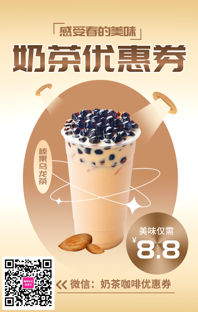 伴随着一句“奶茶YYDS”,这届年轻人将喝奶茶变成了生活方式——不仅用它“续命”,也让它成为了一种消费热点、社交文化。同是饮品,咖啡和奶茶经常会进行对比。在很长一段时间里,咖啡作为“舶来品”,常常是高质量生活的代名词;喝茶被认为是上一代人的习惯。但随着以喜茶、奈雪为代表的新茶饮品牌的发展,这一局面已经出现变化。 年轻人对茶饮的爱并不是短暂的,还是深远、持久的。奶茶高频消费的背后,是年轻人可支配收入的提升。基于这些特征,可以描绘出一个茶饮年轻消费者的立体画像:大学毕业后,他们到不同的城市工作,有一笔自由可支配的收入,也承受着一些工作上的压力,也许是办公室里的下午茶拼单,也许是下班路上的一口补给,或是周末逛街时和朋友“第2杯半价”,他们把奶茶当成日常生活的一部分,也习惯了用较多的成为优质的产品买单。 好消息来了!近期,茶百道奶茶与微信-奶茶咖啡优惠券达成了合作,大家可以从中免费获得奶茶优惠券~具体的领取方法是,在微信公众号查找【奶茶咖啡优惠券】或扫描图中二维码,在下方的“奶茶优惠券”里就能找到茶百道优惠券。在该平台上,用户可免费获得二十余家门店的奶茶咖啡优惠券。想必介绍到这里,很多小伙伴都担心,优惠幅度这么高的优惠券是否需要花钱开通会员才能获得?