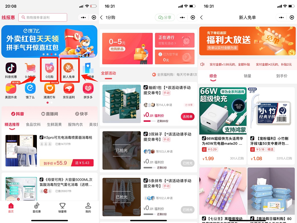 经常网购买买买,过了618还有双十一、双十二,难倒只能等着大促才能享受最优惠的价格吗?又有哪些省钱购物app可以让我们花少量的钱买更好的东西呢?该买得买,但是不能花冤枉钱,要能省则省。网购前先领大额隐藏优惠券,再下单,还能获高额返利! 首先你要知道优惠券一般分公共渠道的和特殊渠道的,公共渠道即进店或者点击详情页就可以看到的;还有一种是特殊渠道推广的优惠券,这种一般就是购物优惠软件来领取,那就比较优惠了。如果要给大家推荐那小编推荐的一定还得是官方认可的正规平台,例如微信【线报惠优惠券】,该平台已与抖音展开合作,近日开展了‘0元购’以及新人免单活动,该平台因为拥有优质资源并且优惠多多,吸引来了无数用户的捧场。接下来小编就将具体步骤分享给大家! 大家只需关注微信【线报惠优惠券】,关注成功以后,点击菜单栏中的“抖音惠购”就会进入商城首页,里面会出现“0元购”以及“新人免单”的字眼。选择“0元购”进入即可购买今日特惠商品,里面包括品勺、钢丝球、指甲钳、口罩、保鲜膜等众多商品。除此之外,选择“新人免单”会进入新人补贴页面,该页面内,所有下单小于2元的商品可享受免单优惠,大于2元的商品系统会自动给你补贴2元,是不是非常优惠呢?