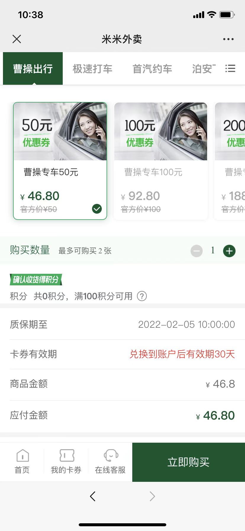 在米米打车券上,原价200元的曹操专车充值卡仅需188元就可以购买,而且充值卡可以累计充值哦。购买成功后,大家可以登录曹操出行APP-我的-钱包-优惠码兑换-确认兑换。充值卡充值后只能用于支付用车费用,不能支付高速费、路桥费、小费等第三方费用。需要注意的是,本产品属于虚拟货品,请兑换无误后再确认收货,一旦收货无法提供售后服务。