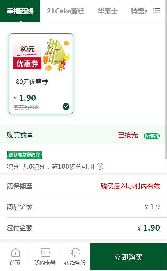 常言道“一年之计在于春,一日之计在于晨”,所以一顿丰盛营养的早晨可以为我们一天的工作和生活打下良好的基础。但是现在的年轻人都比较懒,为了可以多睡一会,连早餐都是“应简尽简”,要么是路边的鸡蛋灌饼、包子烧卖,要么就是便利店中的面包和早餐奶,着急赶地铁的时候甚至连早餐都来不及吃了。所以,幸福西饼就专为年轻人推出了自烤面包系列,同时还推出了大量美食优惠券哦~ 衣食住行一直是我们老百姓最重要的日常活动,尤其是是食物,所谓“民以食为天”,只有吃饱了咱们才有力气干活。,除了平时的中餐西餐之外,在重要的节日比如过生日,约会以及结婚纪念日等等都会买蛋糕来庆祝,这个就是比较浪漫的仪式感。幸福西饼这个大品牌,想必大家都知道,里面除了蛋糕,还有各种各样的面包饼干等等,那么幸福西饼有没有优惠券?美食优惠券领取入口就在微信【餐饮美食优惠券】里~ 关注了公众号之后,点击“更多优惠券”里面就会出现幸福西饼的领券入口。我们只要花1.9元就能领取到幸福西饼的80元优惠券,每个账户仅限兑换一张,仅限购买指定款制订蛋糕商品:榴芒双拼千层、烈焰莓莓、甜心芒芒、一溪椰风、莓莓花语、森林果乐、浪漫果纷。限购买原价商品使用。使用方法是“幸福西饼” 公众号(或“i幸福西饼”小程序)点击菜单栏-我要下单-个人中心-优惠券-点击底部“兑换优惠券”-输入券码-兑换-立即使用-下单购买。 如有质量问题,请于购买后24小时内联系客服,过期作废,非质量问题无法退换货,不同意勿拍。我们领了美食优惠券之后,就可以拿这个美食优惠券去叠加抵扣使用了,这样就可以帮我们省下一大笔开支了。毕竟现在每一分钱都来自不容易,都是我们辛辛苦苦劳动换来的,我们在努力工作的同时也要犒劳我们的胃,保证我们的生活质量哦~ |