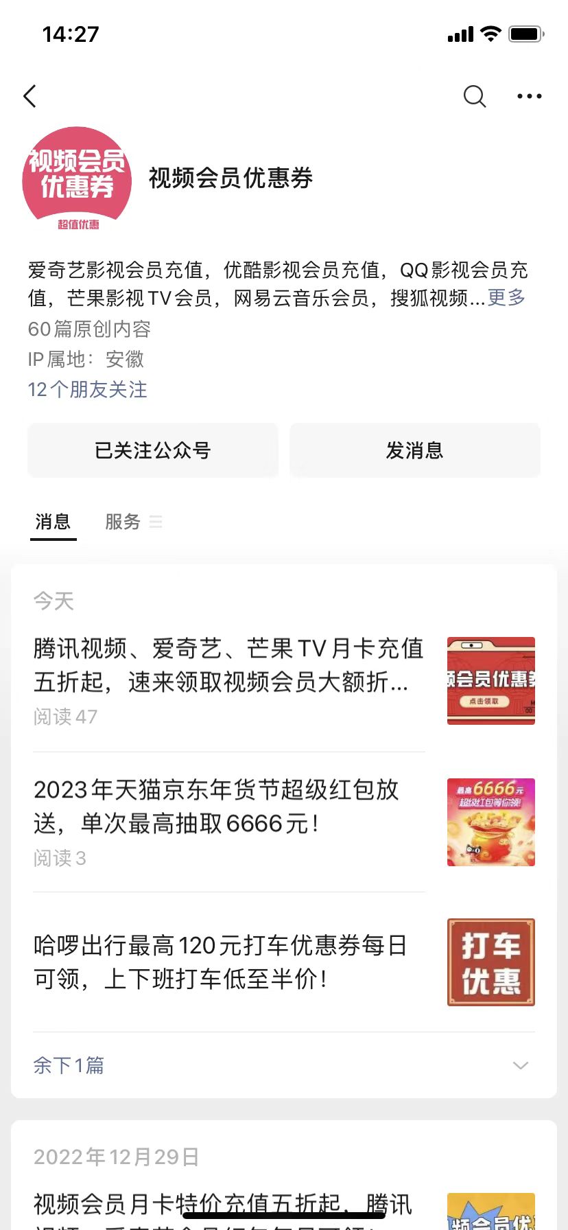 相信不少小伙伴们平常都有听歌的爱好,小编也不例外,我喜欢的歌手有很多,周杰伦就是其中之一,不过我们也都知道周杰伦的许多歌都是要花钱充值会员之后才能够进行收听的,小编每个月都会在QQ音乐上进行会员充值,虽然说一次充值只需要15块钱,但是日积月累下来实际上每年花费的充值会员上的钱还是不少的,那我就最近发现了一个能够充值会员更加优惠的好办法,今天就来把它分享给大家。 操作过程非常简单。首先我们需要打开微信,然后关注一个叫做视频会员优惠券的公众号,进入首页之后就能在底部菜单栏里看到音乐会员优惠券的选项了,点击他,我们不仅可以看到QQ音乐会员优惠券的发放入口,还可以看到其他各种音乐平台的优惠券发放入口,像网易云音乐,酷狗音乐等音乐播放平台,都可以在这里领取到相应的优惠,这样我们在进行会员的充值就能够省下不少的钱了,是不是非常划算呢? 在这个公众号里面我们还可以看到菜单栏的最左侧有一个视频会员优惠券的选项,点击它,我们就可以看到各大视频平台的会员优惠券发放入口了,像小编平常经常用的爱奇艺视频会员优惠券又或者是搜狐视频腾讯视频,芒果TV优酷视频的会员优惠券都可以在这里找到,这样不管是我们想在哪一个视频平台进行观影就都可以享受到充值会员的优惠了,小伙伴们也不用担心充值会员花太多钱了。 不仅如此,我们还可以在这个公众号里看到更多优惠券的选项,只需要点击它,我们就能看到其他各种类型的优惠券,像是外卖优惠券,餐饮美食优惠券,打车优惠券,特价电影票优惠券又或者是购物优惠券都能够在这里领取的。现在关注公众号还能够参加美团饿了么外卖红包发放的活动,参与必领大额红包哦,活动真实有效,小伙伴们快点趁此机会关注公众号领取一波优惠吧。 |