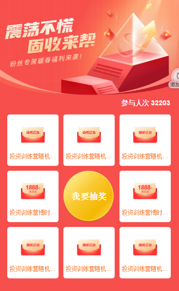【活动内容】:1、本次活动共设置2个任务。任务1:关注兴证全球基金招财号;任务2:将兴全优选进取三个月C类FOF加自选。用户完成上述2个任务后,即可参与抽奖。2、本活动奖品为随机现金红包,红包面额为0.1-0.5元不等,共300000个。活动不设绝对中奖,奖品数量有限,领完即 ...