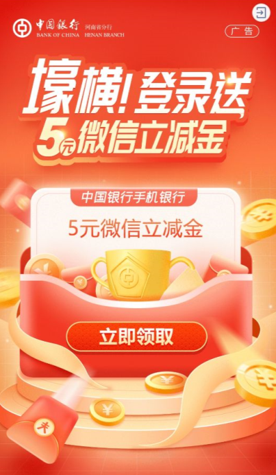 【活动内容】:中国银行河南分行手机银行客户(非当月开通客户),活动期间,登录中国银行手机银行app,即可领取5元微信立减金。每位客户至多可领取1次奖励,数量有限,先到先得。注意:同一设备只能登录一个手机银行账户领取一次奖励,如更换账户造成奖励发放失败的, ...