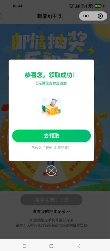 【活动内容】:1、微信小程序搜索“邮储好礼汇”->点中间达标有礼->进去抽奖,即有机会抽到话费和微信立减金!2、如果没有资格用邮政卡就给微信余额充值38元->等3~7天再来抽就有机会了!PS:如果微信绑定的手机号不是预留的号去我的,修改手机号码,改成预留的号!抽中 ...
