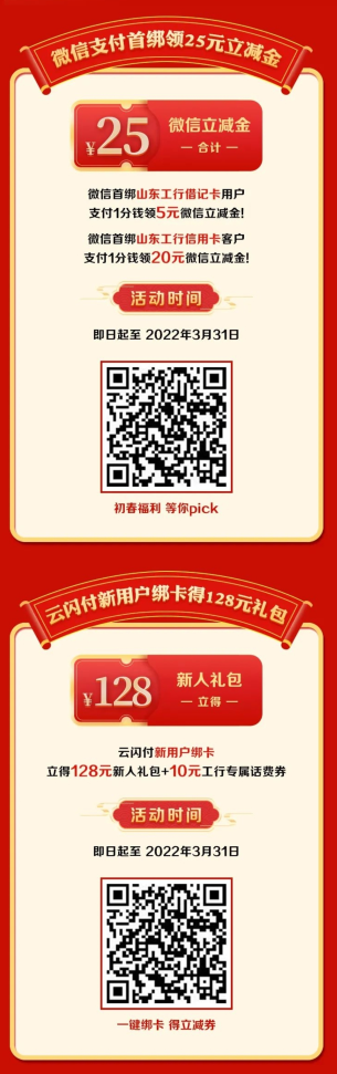 【活动内容】:1、微信支付首绑领25元立减金微信首绑山东工行借记卡用户支付1分钱领5元微信立减金,微信首绑山东工行信用卡客户支付1分钱领20元微信立减金。2、云闪付新用户绑卡得128元礼包云闪付新用户绑卡立得128元新人礼包+10元工行专属话费券。有工商银行的小伙伴都 ...