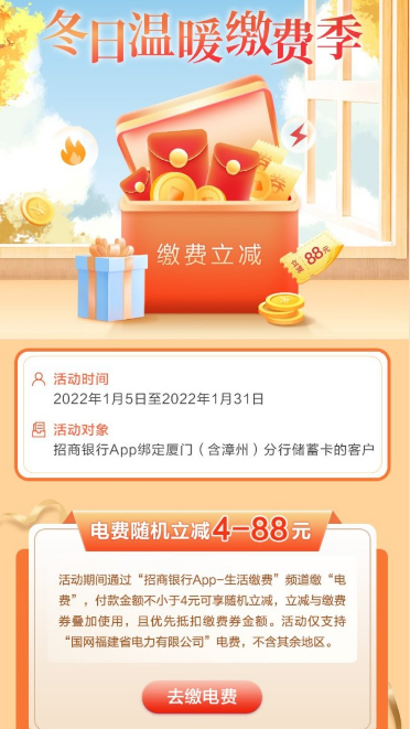 【活动内容】:招商银行App绑定厦门(含漳州)分行储蓄卡的客户,活动期间通过"招商银行App-生活缴费"频道缴电费”,付款金额不小于4元可享随机立减,立减与缴费券叠加使用,且优先抵扣缴费券金额。活动仅支持国网福建省电力有限公司”电费,不含其余地区。【注意事项】 ...