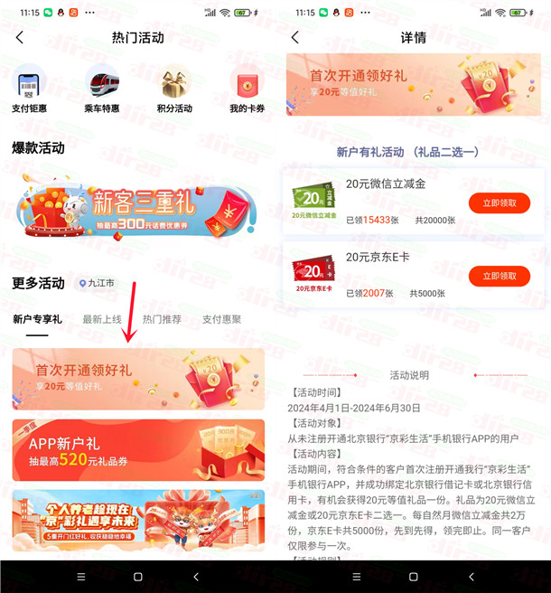 【活动内容】: 参加北京银行举办的首次开通领20元好礼活动,通过下载打开北京银行APP进去活动页面,首次注册开通一张北京银行二类电子卡,就可以领取到20元微信立减金、20元京东卡,注册前可以看到当前还剩余的奖励数量,如果没有数量了就可以不用注册。 小编提示详细 ...