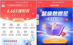 【活动内容】:参加上海证券举办的超级数据星答题赢红包活动,通过下载打开上海证券APP进去活动里(只要手机验证码登录就行),每天都有1次免费答题的机会,在30秒时间内根据答对的题目数量获得随机金额的现金红包,累积得到的红包金额满1元提现,如果不满1元可以每天都去答一下。