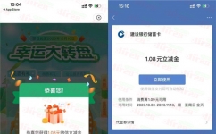 参加裕农通举办的幸运大转盘抽最高88元微信立减金活动,这个活动注册裕农通的可以去,不限制地区,通过打开裕农通APP进去活动里,先在首页左上角将地区手动修改为“广西”任意地区,再点击中间图片“幸运大转盘”进去活动里,有机会中到1-88元微信立减金,中到的微信立减金全国建行卡都可以抵扣。