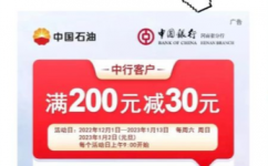【活动内容】: 1、加油支付享满减 截止至2023年1月13日每周六、周日2023年1月2日(元旦)每个活动日上午9:00开始,客户在指定中国石油加油站(点击下方按钮可查看参与加油站)加油时,使用微信绑定中国银行河南分行银行卡(含借记卡和信用卡)支付,可享受满200元减30元优惠。 单客户每个自然月最多可享受2次优惠(借记卡、信用卡各1次),每个活动日名额有限,先到先得,用完即止。 2、信用卡还款享立减 截止至2023年1月27日 每天上午8:00开始,客户通过“支付宝”中的信用卡还款功能,使用河南省中行借记卡还任意银行信用卡单笔满1000元(含以上)立减15元。活动期间客户每月限享1次优惠,每个活动日名额有限,先到先得,用完即止。 温馨提示:客户参与活动时,在输入支付密码的时候,如果没有看到显示优惠,说明当日活动名额已用完或已超过使用优惠次数限制。