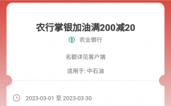 【活动内容】: 用户在河南省内中国石油指定活动门店加油,使用农业银行APP,并通过使用所绑定的农业银行622821、622822、622823、622824、622825、622826、622827、622828、622840、622841、622842、622843、622844、622845、622846、622848、622849、620059、621282、621336、621619、621671、623052、623056、620501、622847、623050、623053开头借记卡付款码进行支付,有机会享单笔满200元减20元优惠。注:本活动不与消费券等其他优惠同享,单用户单日限享1次,每月限享2次优惠。每活动日限前1730个名额,所有站点名额共享,先到先得。