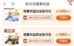 【活动内容】:这个活动需要有中国电信手机号码才可以参加,通过打开中国电信APP进去积分兑换页面,用2280个积分可以兑换1年橙翼权益黄金版会员,兑换后就可以去翼支付APP里每个月领取一张10元生活缴费券、或者0撸10元实物都可以,每个月都可以去领1次,每天10点会补充库存(需要每天10点去领)。