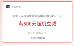 即日起至2024年8月31日,用户通过去哪儿旅行APP,在支付页面点击银联三色标,选择银联手机闪付完成订单支付,有机会享受满300元随机立减3-18元优惠,单用户每个活动日三种支付方式(云闪付APP、银联手机闪付、银行APP)可各享1次优惠,每种支付方式整个活动期间可各享2次优惠。每日名额有限,用完即止。活动剩余名额请详见云闪付APP活动展示券。部分商品:如租车、会员服务、美食购物、途家民宿、酒店到店付房型或担保房型、12306火车票、风控类产品等或不支持银联云闪付APP或银联手机闪付或银行APP支付方式的商品不参与本活动。